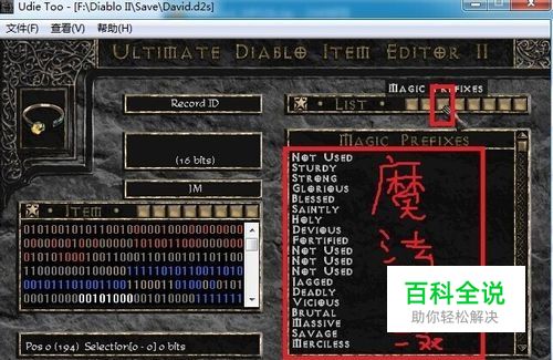 弄一个三重冠 或者 权冠作为底材 ,也就是头环或者宝冠的扩展级或者精华级,不能用头环或者宝冠,否则最终做出来只能有2凹槽。颜色无所谓,黄色蓝色白色暗金绿色都可以,建议去赌一个。 然后用UdieToo打开存档,打开物品栏,可以看见红框内的权冠。