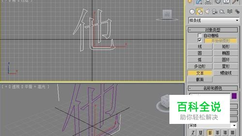 1.打开电脑中的3dmax2010软件,在前视图,用文本工具上输入文字他。如下图所示