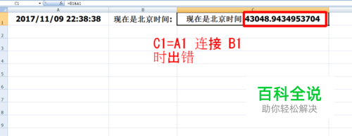 在A1存储格输入年月日时分秒,在B1存储格输入“现在是北京时间:”在C1存储格套用公式 A1&B1时,出现异常。