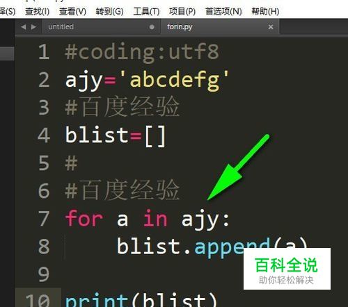 那么便可以用forin来迭代ajy并保存值到a变量里头即可。接着在for循环里边用append方法即可把解析到的单个字符添加到列表了。