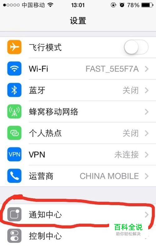 首先先开点设置。设置里面有一个通知中心点开。一直往下拉界面。