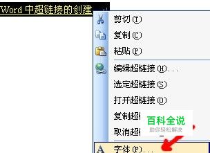 首先要先选中加超链接的文字,然后单击鼠标右键,在弹出的快捷菜单中选择“字体”,或选择“格式”菜单中的“字体”。