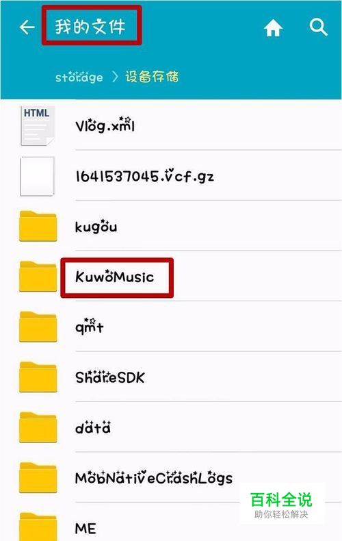 找到手机里的 我的文件,并且找到 KuwoMusic文件夹。