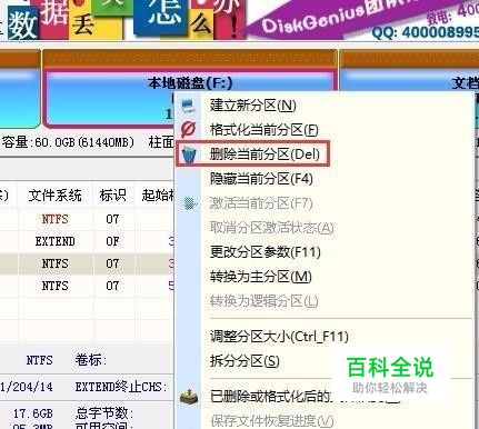 这时我们就能看到我们各个磁盘情况,将要分配给c盘的磁盘右键,选择删除当前分区,如图所示: