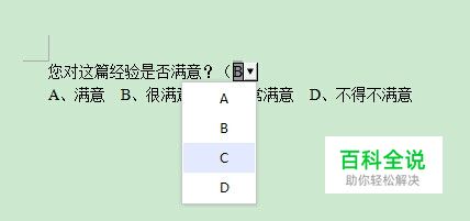 对于做问卷调查的工作人员来说,经常会使用到选择题的问题,一般在网上有专门的程序可设定选择。但对于某些问卷并不适合公开的,可利用文档形式发送给填写的人。但是如果选择题还是需要填写的人自己写哪个答案,无疑有点麻烦,有没有什么办法也可以直接选择ABCD其中一个答案的方法呢?下面就教大家wps文字怎么做下拉选项框,这样直接选择字母答案就可以了。
