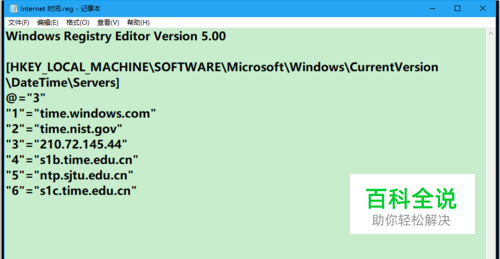 Windows10系统时间设置、同步、同步服务器修改方法 添加Windows10系统时间同步服务器: 我们把下面的内容复制到记事本中: ———————————————————————————————— Windows Registry Editor Version 5.00 [HKEY_LOCAL_MACHINE\SOFTWARE\Microsoft\Windows\CurrentVersion\DateTime\Servers] @="3" "1"="time.windows.com" "2"="time.nist.gov" "3"="210.72.145.44" "4"="s1b.time.edu.cn" "5"="ntp.sjtu.edu.cn" "6"="s1c.time.edu.cn" ———————————————————————————————— 说明:其中“1”和“2”为系统默认的时间同步服务器,“3”~“6”为自选添加的时间同步服务器: “3”:国家授时中心服务器IP地址 “4”:清华大学 “5”:上海交通大学网络中心NTP服务器地址 “6”:北京大学 ———————————————————————————————— 下面是可供选择的 国内时间同步服务器: 210.72.145.44 (国家授时中心服务器IP地址) ntp.sjtu.edu.cn 或 202.120.2.101(上海交通大学网络中心NTP服务器地址) s1a.time.edu.cn 北京邮电大学 s1b.time.edu.cn 清华大学 s1c.time.edu.cn 北京大学 s1d.time.edu.cn 东南大学 s1e.time.edu.cn 清华大学 s2a.time.edu.cn 清华大学 s2b.time.edu.cn 清华大学 s2c.time.edu.cn 北京邮电大学 s2d.time.edu.cn 西南地区网络中心 s2e.time.edu.cn 西北地区网络中心 s2f.time.edu.cn 东北地区网络中心 s2g.time.edu.cn 华东南地区网络中心 s2h.time.edu.cn 四川大学网络管理中心 s2j.time.edu.cn 大连理工大学网络中心 s2k.time.edu.cn CERNET桂林主节点 s2m.time.edu.cn 北京大学