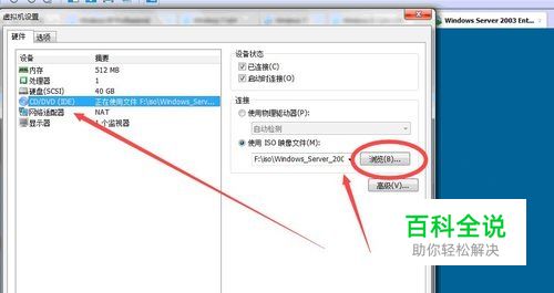 图1 首先插入系统光盘,安装DNS服务,这我用虚拟机来演示,打开虚拟机设置-选择CD/DVD选项-单击右边“浏览”找到系统安装盘