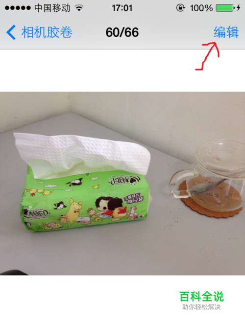 点开相册,找到你所拍摄的照片,点击屏幕上的:“编辑”,进入图片编辑模式,如下红色箭头所示: