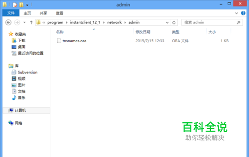 在D:\program\instantclient_12_1下面建network文件夹,在network文件夹下面建admin文件夹,在admin文件夹下面建tnsnames.ora文件,文件中的内容如下:自己修改SERVICENAME 还有IP和DBname SERVICENAME= (DESCRIPTION = (ADDRESS_LIST = (ADDRESS = (PROTOCOL = TCP)(HOST = 192.168.1.201)(PORT= 1521)) ) (CONNECT_DATA = (SERVICE_NAME = DBname) ) )