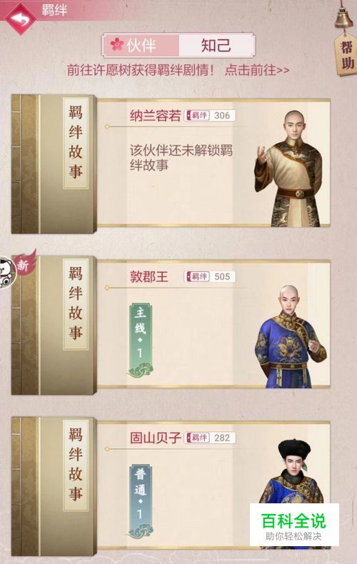 宫廷秘传中跟某个伙伴或者知己的羁绊值达到一定量就会需要完成羁绊剧情,那么宫廷秘传怎样完成和敦郡王的羁绊剧情呢?下面就来介绍一下完成和敦郡王羁绊剧情的方法,希望对你有所帮助。