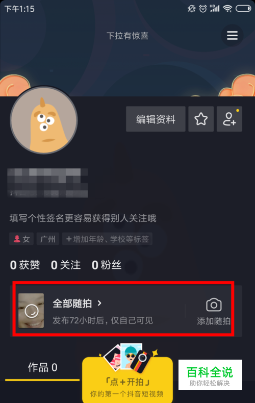登录后,将页面切换到【我】,在这个界面的中部就可以看到添加随拍的按钮了,如下图所示。