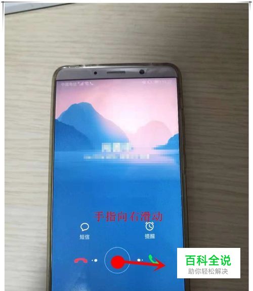 华为Mate 10手机来电接听的方式 正常情况下Mate 10手机,可以通过以下几种方法来接听来电: 方法一:在锁屏情况下,用手指如图所示,从中心向右滑动到绿色图标处,松开即可接听来电。