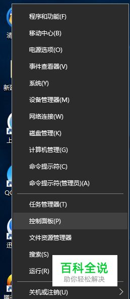 鼠标右键点击开始按钮,然后选择控制面板。