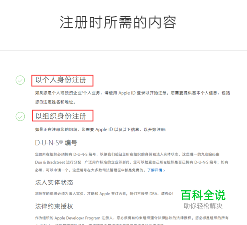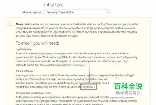 在【Entity Type】部分选择【Company/Organization(公司/组织)】之后,下方会弹出警告,大意是申请公司开发者账号需要提供邓百氏编码( D-U-N-S Number),如果不知道公司是否已经拥有了此标识码,可点击【Check now】查询。