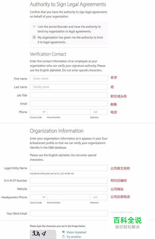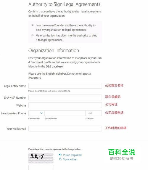 获得邓白氏编码之后,选择【Continue】,然后再次进入信息填写页面。【Authority to Sign Legal Agreements】部分有两个选项,如果你是公司所有者,可以选择第一项。