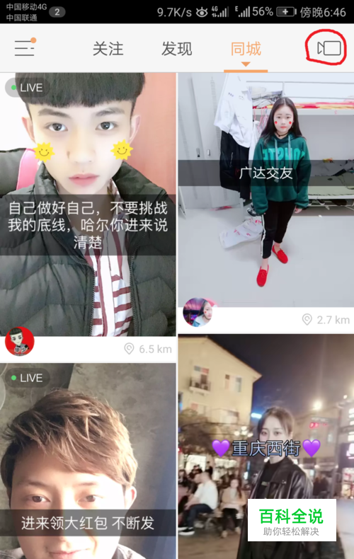 首先打开快手,看到右上角有一个录像的图标,点击图标