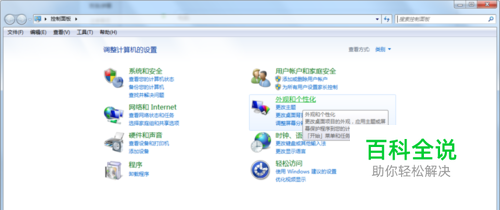 第一种办法,点击开始,找到控制面板选项,进去后找到外观和个性化选项。