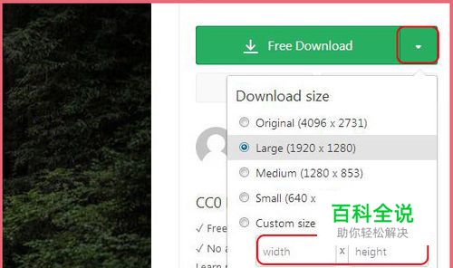 【免费下载指定尺寸图片】 网页的语言是英文和德语,还是默认英文好翻译,找到自己喜欢的图片可以 单击点开,再点击右侧的“Free Download”小箭头下面可以选择图片的尺寸,也可以自己输入需要的尺寸下载。