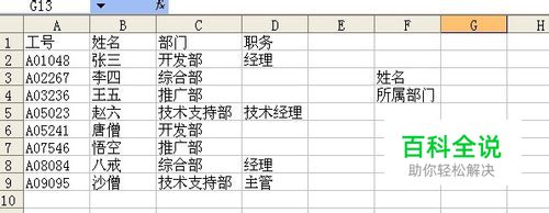 在G4单元格输入公式: =IF(ISNA(MATCH(G3,$B$2:$B$9,0)),"无此人",VLOOKUP(G3,B2:D9,2,0)) isna函数用判断match函数的结果是否为#N/A错误,如果是返回true,否则返回false,利用if函数返回相应的结果。 当G3单元格无输入或输入错误时,函数返回“无此人”。否则返回所属部门。