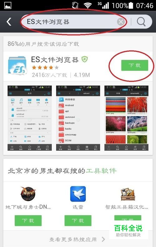 在最上面的搜索框里面,输入 ES文件浏览器,进行搜索。这是搜索结果。