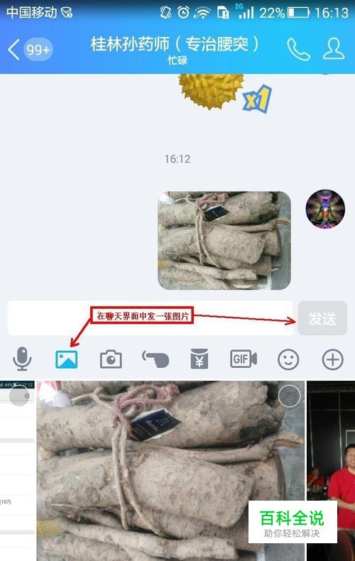 点击如图所示的图形输入图标,选择一张图片,在聊天界面上发送一张图片。