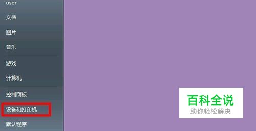 第一步:如果打印机是通过USB连接到电脑的我们可以共享这台打印机,我们点击电脑左下角开始菜单,选择“设备和打印机”选项。