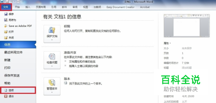 1.打开word,(笔者使用的是2010年版的)点击“文件”菜单,单击“选项”