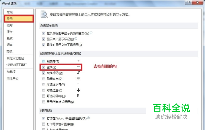 2.进入word选项之后,单击左侧的“显示”那一项,在右边找到“空格”那一项,去掉“空格“前面的勾即可