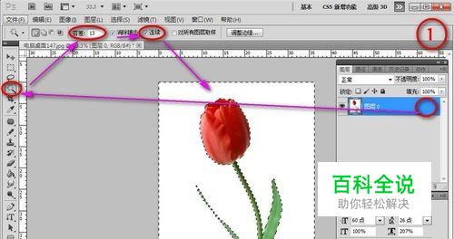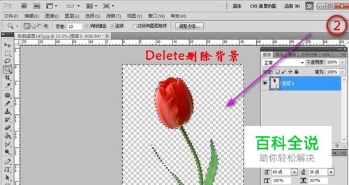 魔术棒抠图 适用范围:所扣图像和背景色差明显,背景色单一,图像边界清晰。 方法意图:通过删除背景色来获取图像。 方法优点:直观 方法缺点:对散乱的毛发没有用。 方法步骤:打开图片→双击图层解锁→单击“魔术棒”→设置属性“连续”前打勾;设置合适的“容差”→点背景色→按DELE键,删除背景色,就得到了单一的图像。