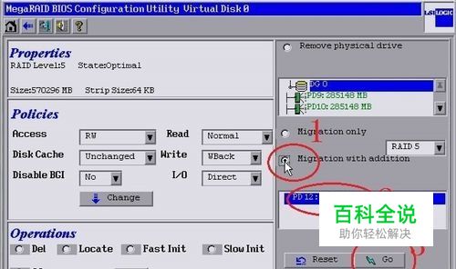 如图,显示出了当前阵列的一些信息,这里我们要做3步操作: 1是选中“Migration with addtion”(即将添加的盘融合进来); 2是选中你要添加的硬盘,这个就是上个界面中显示蓝色的那个盘; 3,最后点击“Go”按钮。