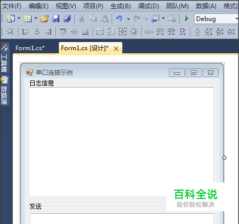 在新程序界面空白窗口上放置合适的控件:包括, 显示操作流程和串口接收数据的textbox控件; 用于发送数据的【发送】button按钮; 用于输入发送数据的【发送】textbox文本框。