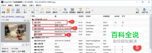 在电脑中打开magicEXIF软件、软件打开之后随意打开一张图片,打开图片之后点击下方的拍摄信息可以后的相关拍摄信息、如下图1为型号,是乐视X620手机。从2可以看出图像是否经过修改,3可以看出设备生厂商为乐视手机,4同理,5也可以看出图象为原始照片。