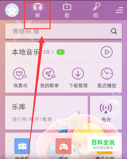 首先在手机上打开【酷狗音乐】这款应用,然后在首页上方点击【听】这个按钮,如下图所示。