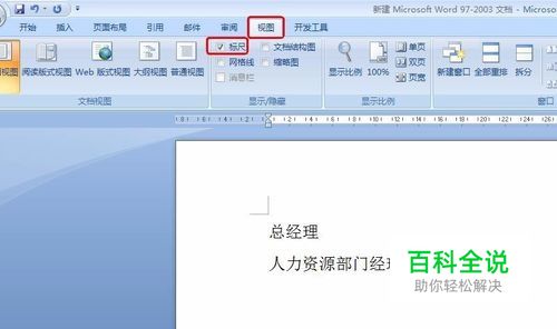 比如,我们要把“总经理”和“人力资源部门经理”这两行字对齐,并让两行字居中,如何操作? 在word文档里,点击 视图,勾选 标尺。