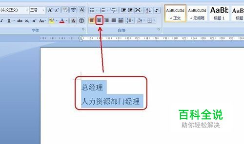 然后点击 分散对齐。 注意,以上第3~8步都是对“总经理”这行短字进行的操作。