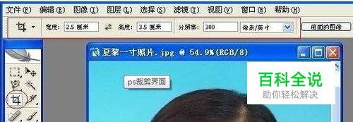 1、在工具栏,点裁剪工具(调宽度:2.5厘米,高度:3.5厘米,分辨率:300像素),在照片上选取合适的位置,点属性栏(确定√)。如图1所示