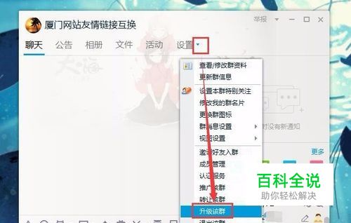 首先我们打开我们需要升级的普通群聊天窗口,点击设置下拉框中的升级该群。