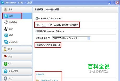 我们先来看基本设置,可以勾选设置几分钟不在时,自动显示为离开状态,程序语言默认为简体中文。也可以选择其他任务中编辑您的个人资料和更改您的图片。