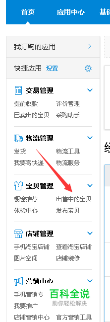 打开淘宝“卖家中心”,找到“出售中的宝贝”打开