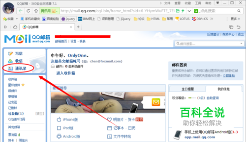 进入QQ邮箱首页后,点击左侧的通讯录菜单项,进入通讯录。