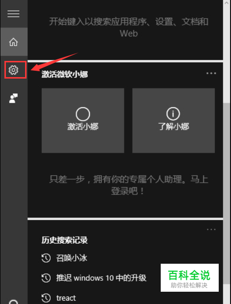 2、使用Windows+S快捷键或者直接点击左下角小娜图标,打开Cortana界面,选择左侧的齿轮图标;