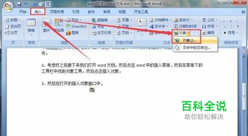 考虑好之后接下来我们打开word文档,然后点击word中的插入菜单,然后在菜单下的工具栏中找到对象工具,然后点击插入对象。