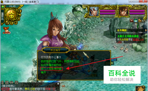 来到蓬莱岛(23.45)就可以看到米兰仙子了,点击米兰仙子进行对话。选择“学习人宠合体技能”。
