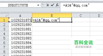 如下图所示效果 我要将单元格区域A1:A10这一区域,加一个相同的后缀“@qq.com",并将结果列于B列