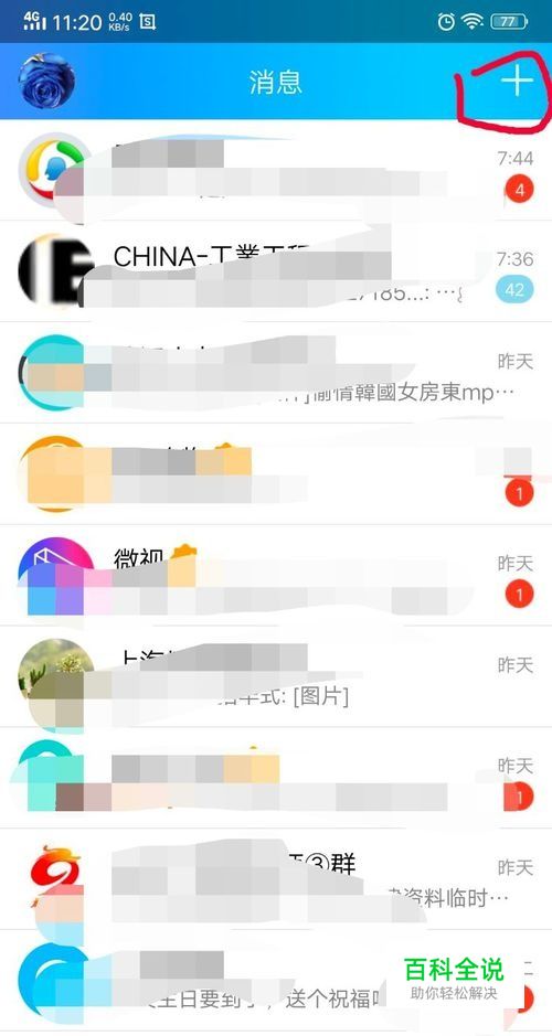 在手机桌面上点击手机QQ,输入账号和密码,登陆手机QQ主页。进入手机主页后,我们会看到主页右上角有一个“+”图标,点击此图标。如下图所示。