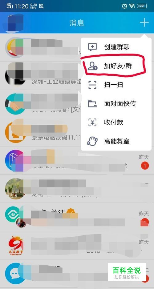 点击加号图标后,我们会看到下拉菜单,点击菜单上的“加好友/群”选项,如下图所示。