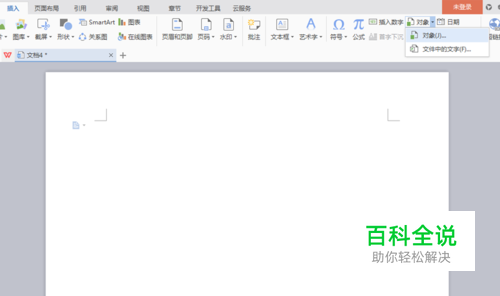 首先启动wps文字,新建一个文档,执行插入-对象命令。