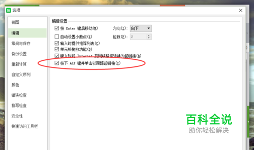 六、在“编辑”选项的右侧窗格中,找到“编辑设置”组中的“按下ALT键并单击以跟踪超链接”选项,并将其勾选,然后再点击“确定”按钮即可。如图所示;