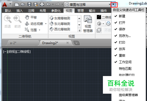 首先点击【草图与注释】后面的一个下拉按钮,选择【显示菜单栏】。