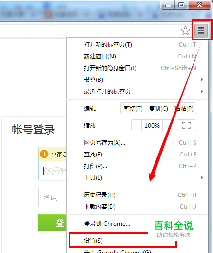 点击浏览器右上方的【自定义及控制】按钮,弹出下拉菜单,在下拉菜单里找到【设置(S)】